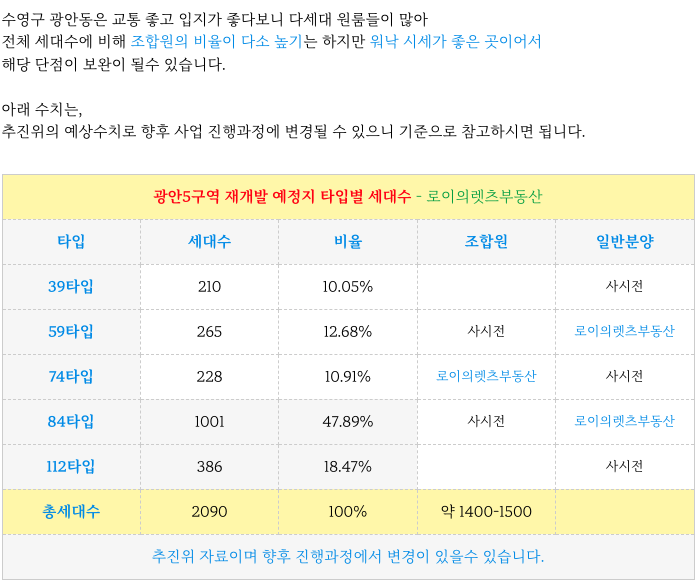 광안5구역 재개발 현재의 예상 타입별 세대수 입니다.