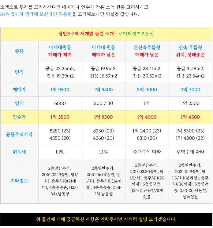 광안5구역 재개발 현 인수가 소액 + 최저 시세 물건 으로 정리하여 소개해 드리겠습니다.