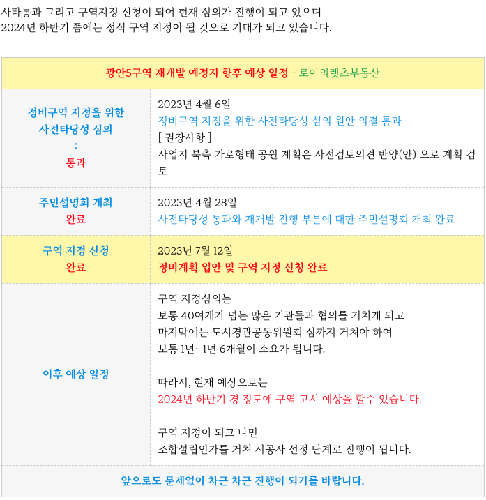 광안5구역 재개발의 현재까지의 진행상황 정리등 추가 정보는 아래 페이지를 참고 부탁드립니다.