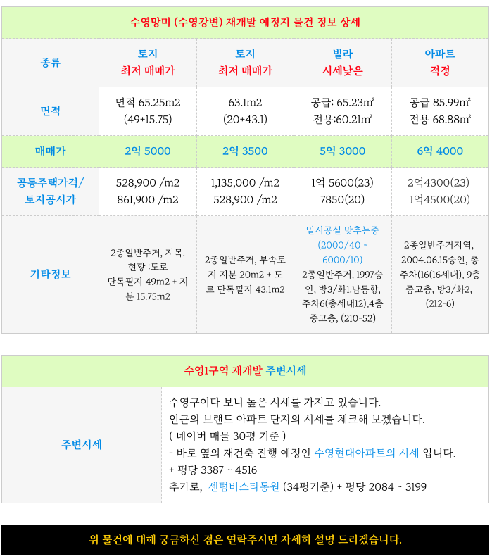 수영1구역 재개발 현 소액 및 가능 물건 정보를 소개해 드립니다.