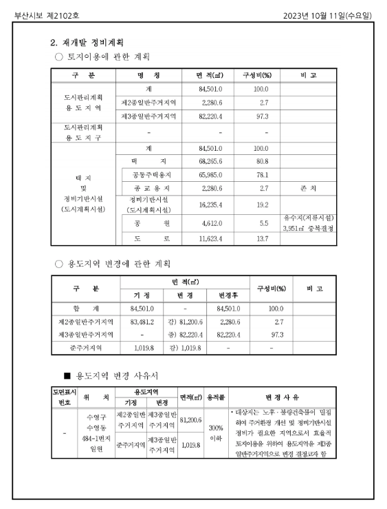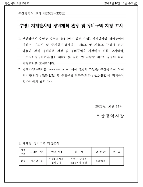 수영1구역 재개발이 드디어 정비구역 지정 고시가 되었습니다.