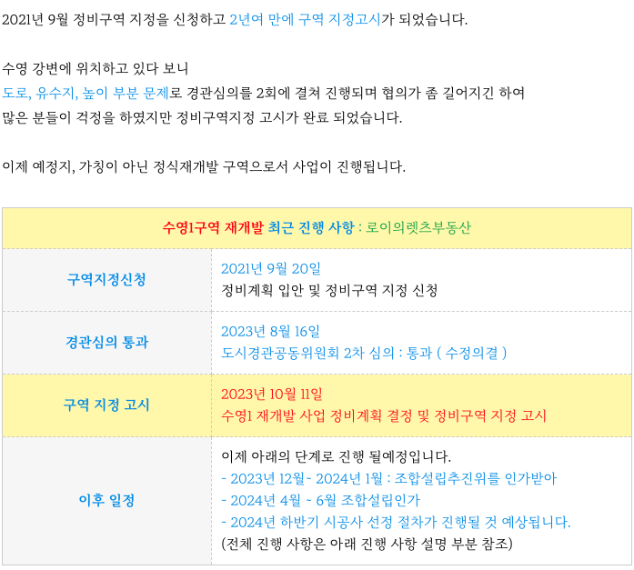 수영1구역 재개발의 현재까지의 진행상황을 정리등 추가 정보는 아래 페이지를 참고 부탁드립니다.