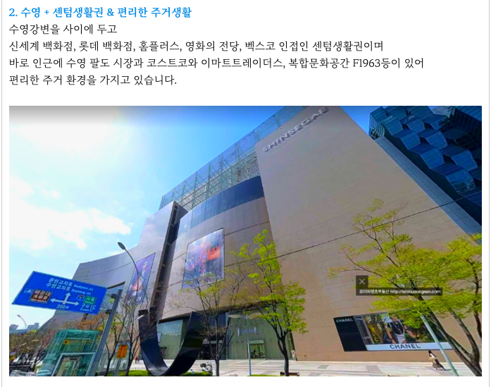 센텀 생활권으로 우수한 실거주와 자연환경을 품어 좋은 입지를 가지고 있고