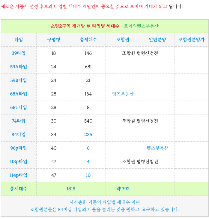 조합원분들의 다수가 84타입 이상의 세대수를 더 늘리는 것을 원하고 있습니다.