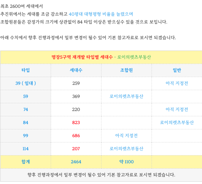 명장5구역 재개발 예정지의 추진위의 예상 타입별 세대수 입니다.