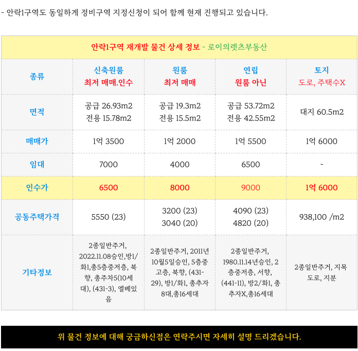 안락1구역 재개발 예정지의 인수가 소액 물건도 정리하여 소개 드립니다.
