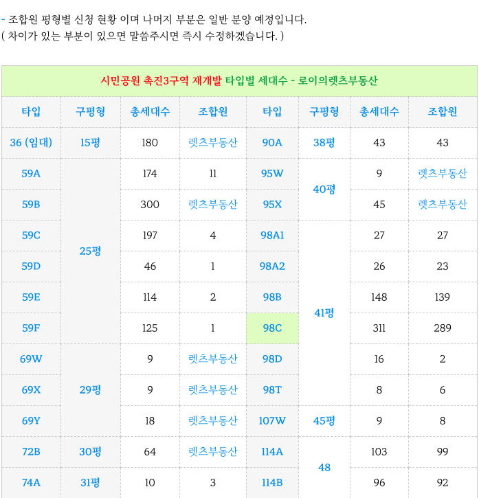시민공원 촉진3구역 재개발 의 각 타입별 세대수 정리 하여 드립니다.