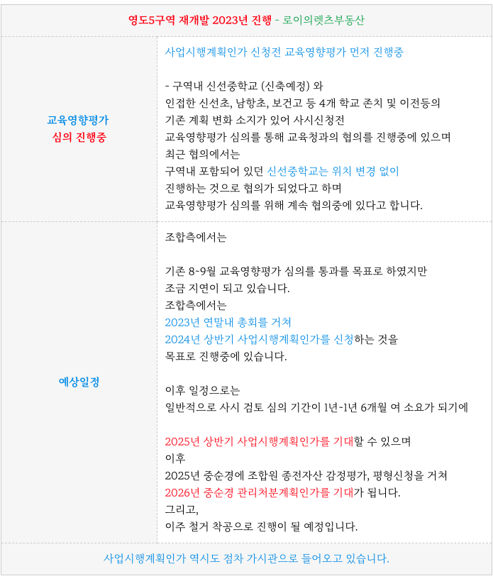 영도5구역 재개발은 현재 교육영향평가를 진행중에 있습니다.