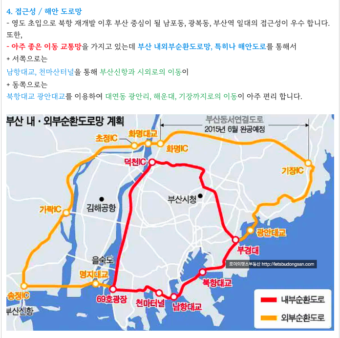 특히나, 부산 내외부순환도로망, 특히나 해안도로를 통해서 내외부 이동성이 아주 좋습니다.