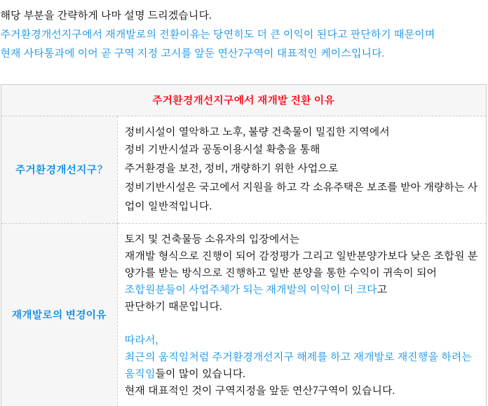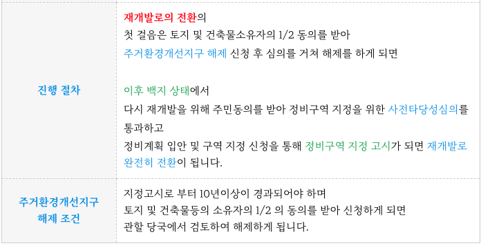 여러 곳에서 주거환경개선지구를 해제하고 재개발로 전환하여 진행하려는 움직임이 있습니다.