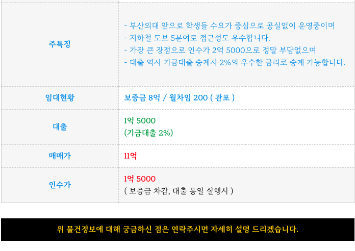 - 부산외대 앞으로 학생들 수요가 중심으로 공실없이 운영중이며