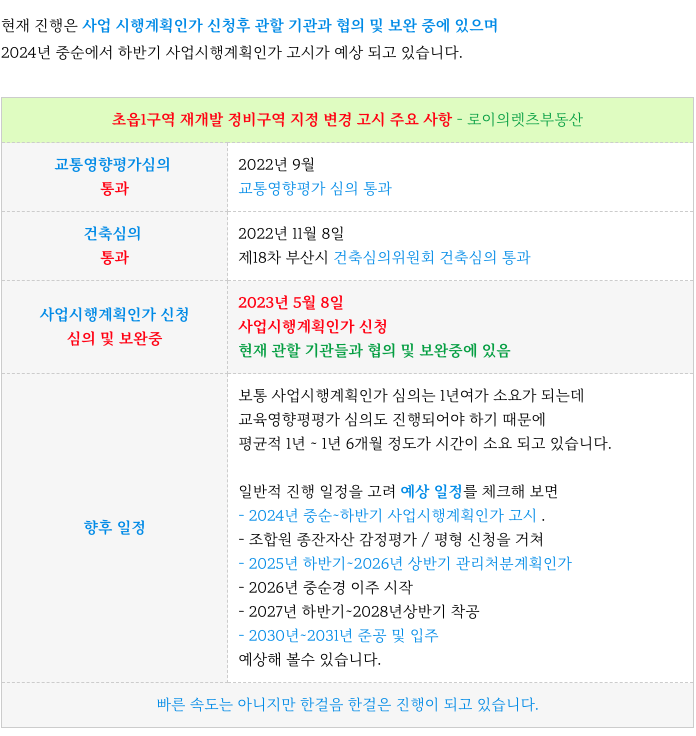 초읍1구역 재개발의 현재까지의 진행상황을 정리등 추가 정보는 아래 페이지를 참고 부탁드립니다.