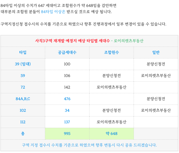 사직3구역 재개발 의 현 추진의 예상 타입별 세대수 입니다.