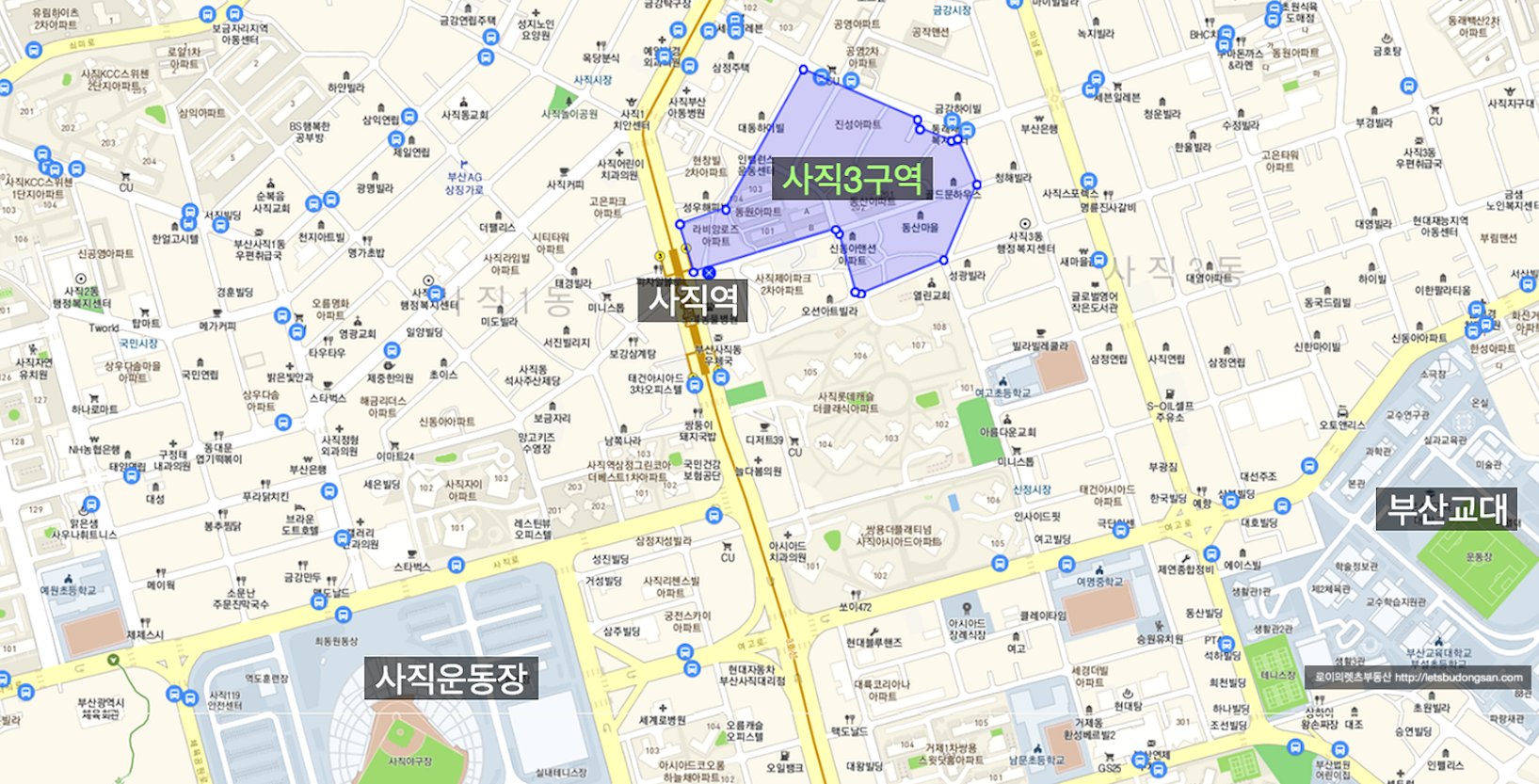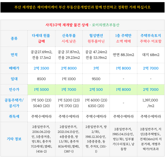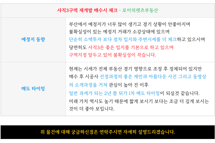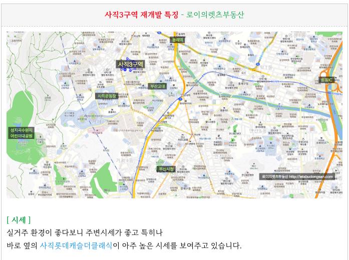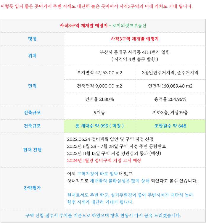 안녕하세요. 로이의렛츠부동산 ( 제이에이케이 부산 부동산중개법인 ) 입니다. 사직3구역 재개발 [ 초역세...