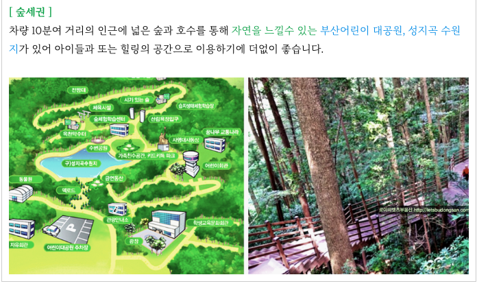 차량 10여분 거리에 거대한 숲과 호수가 있는 초읍 성지곡수원지, 어린이 대공원이 있어서