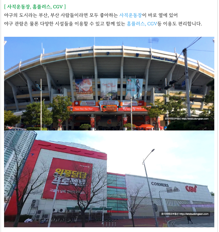 야구의 도시 부산의 사직운동장이 도보 거리에 있어 야구 관람이 편리하고