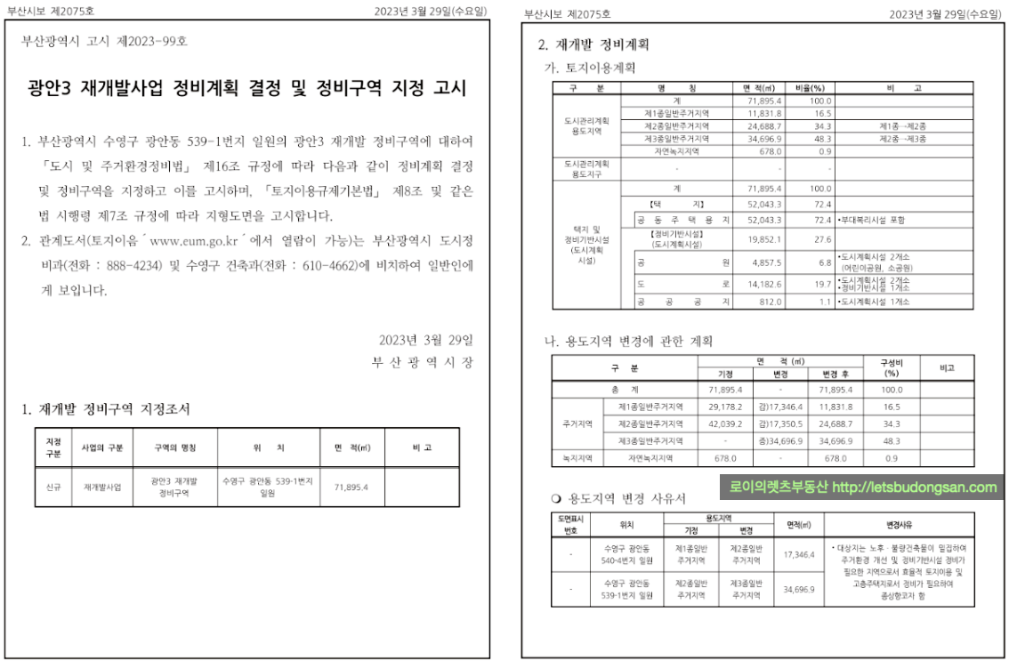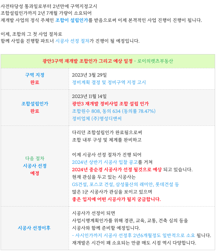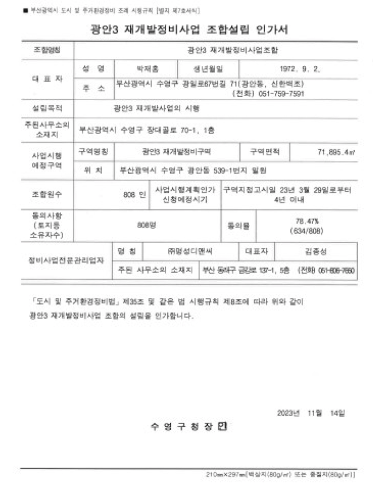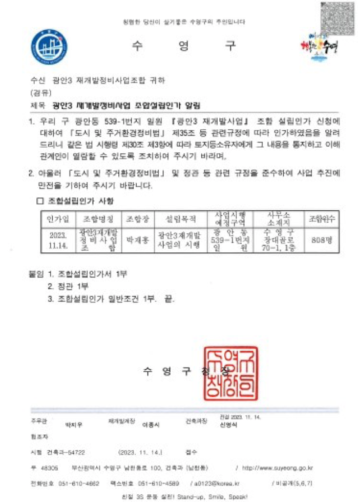 광안3구역 재개발 은 드디어 조합 설립 인가 를 득하였습니다.