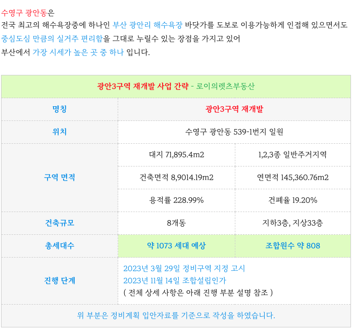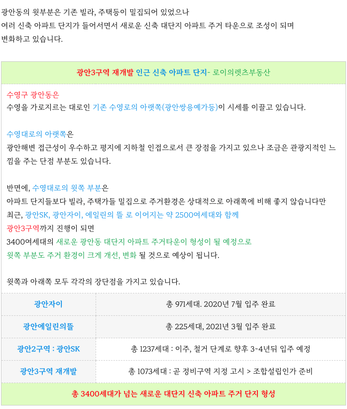 수영구 광안3구역 재개발 이 위치한 광안동의 주변 상황을 정리해 드리겠습니다.