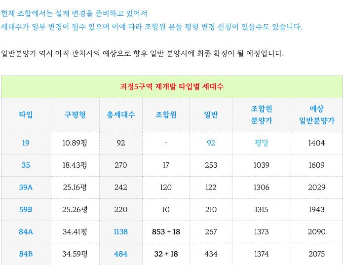 괴정5구역 재개발의 현재의 각 타입별 조합원 분양가와 세대수 입니다.