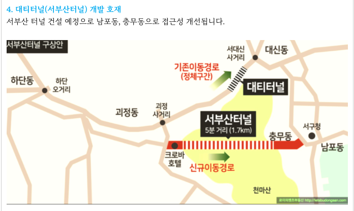 서부산터널(대티2터널) 개발로 남포동 및 부산역 등 중구로의 접근성 또한 개선되어지는