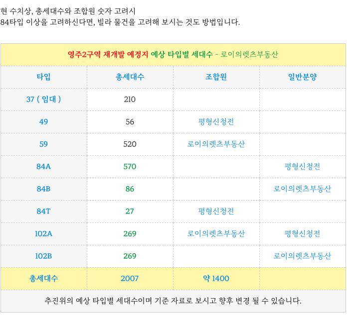 영주2구역 재개발 예정지 추진위 추정 예상 타입별 세대수 입니다.
