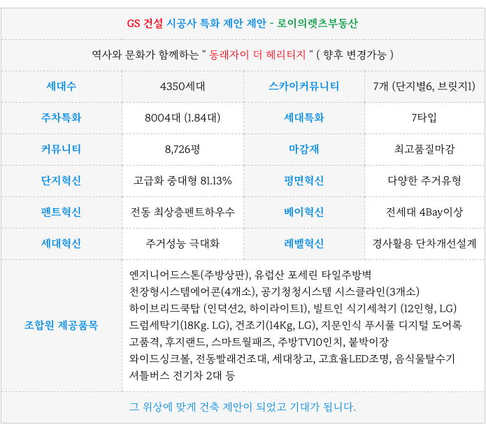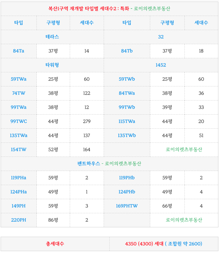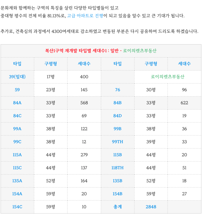 동래구 복산1구역 재개발 GS건설의 특화 제안에 따른 각 타입별 세대수입니다.