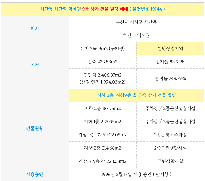 하단역 역세권 대로변에 위치하고 있는 일반상업지 올근생 9층 건물 입니다.