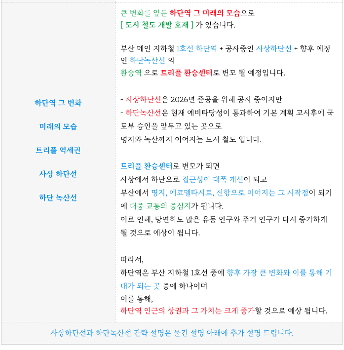 - 미래가치 우수 (사상~하단선 지하철 개통시 환승 역세권으로 큰 효과 기대)