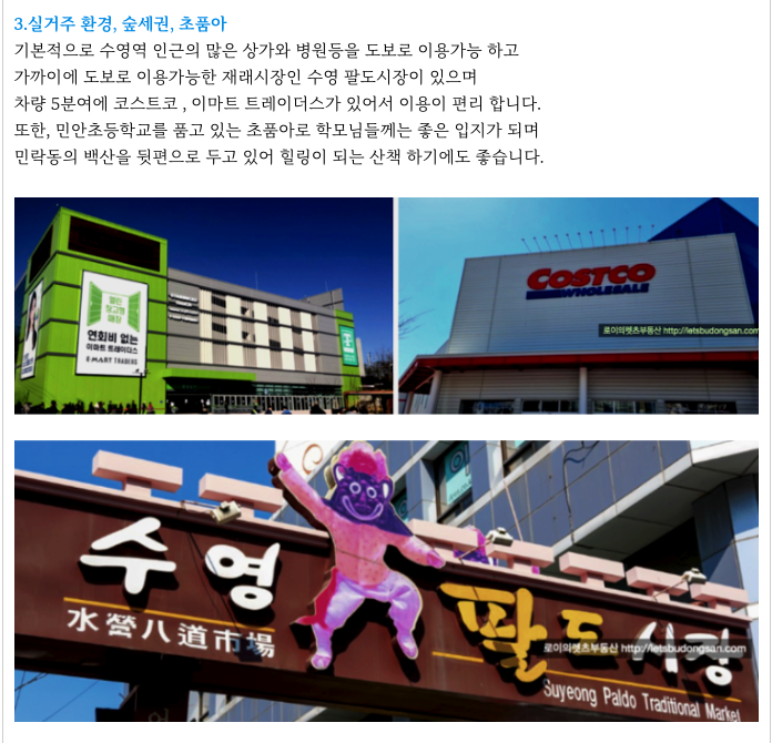 - 팔도시장, 수영역의 많은 상가, 병원, 인근 트레이더스, 코스트코, 신세계백화점