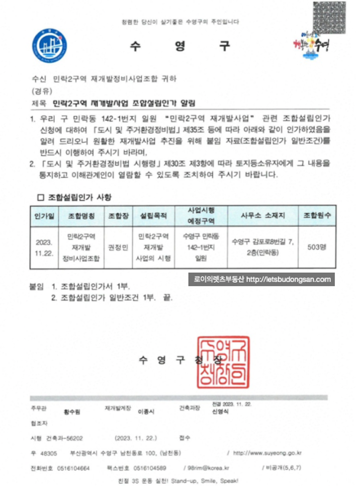 민락2구역 재개발은 조합 설립인가 완료 되었습니다.