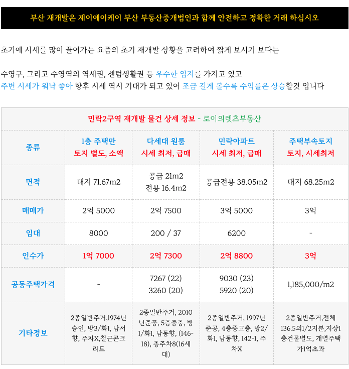 안녕하세요 로이의렛츠부동산 ( 제이에이케이 부산 부동산중개법인 ) 입니다. 오늘은 민락2구역 재개발 시...
