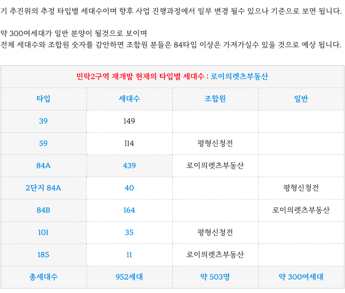 민락2구역 재개발 추정 타입별 세대수 소개하여 드립니다.
