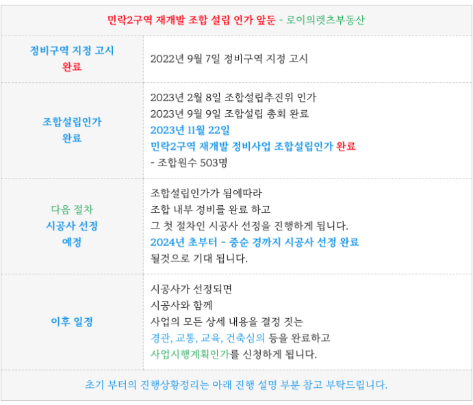 민락2구역 재개발의 현재까지의 진행 상황 정리 등 추가 정보는 아래 페이지를 참고 부탁드립니다.
