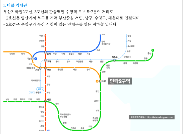 수영역 도보 5~7분여 거리에 위치한 역세권 에 위치하고 있으며