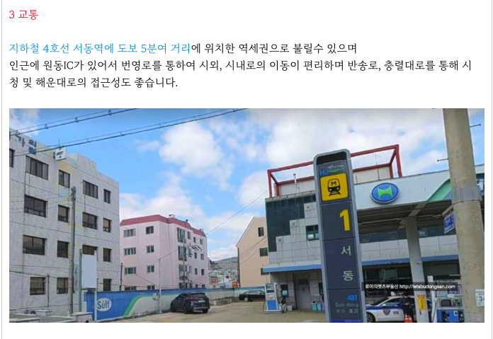 지하철 4호선 서동역에 도보 5분여 거리에 위치한 역세권으로 불릴수 있으며