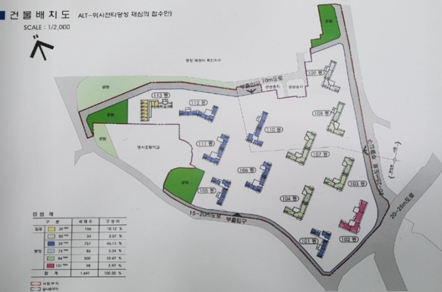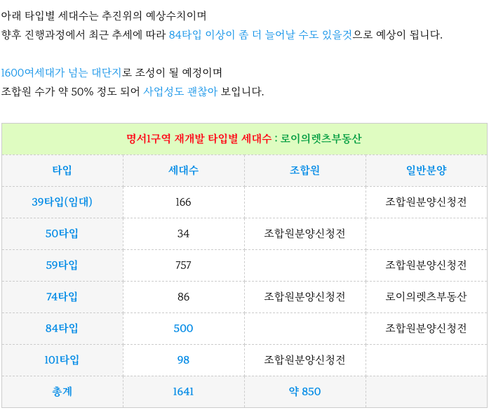 명서1구역 재개발 예정지의 추진위의 예상 타입별 세대수 입니다.