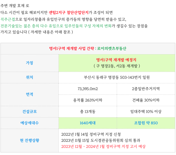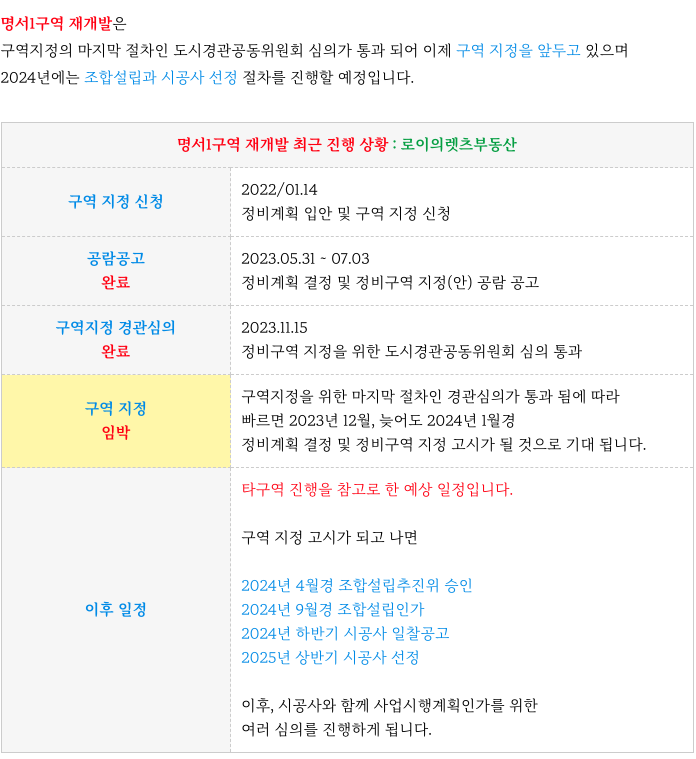 명서1구역 재개발 현재까지 주요 진행 상황 정리등 추가정보는 아래 페이지를 참고 부탁드립니다.
