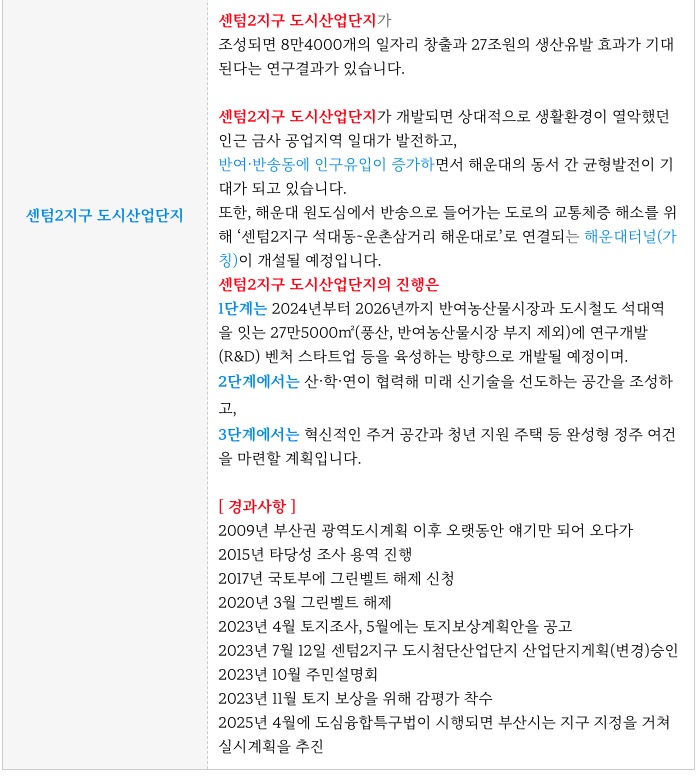 센텀2지구 도시산업단지의 내용을 간략히 정리하여 드립니다.