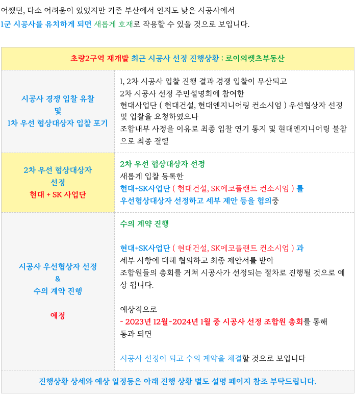 이후 시공사화의 협의와 제안을 받아 조합원 총회를 거쳐 수의계약을 진행할 것으로 예상 됩니다.