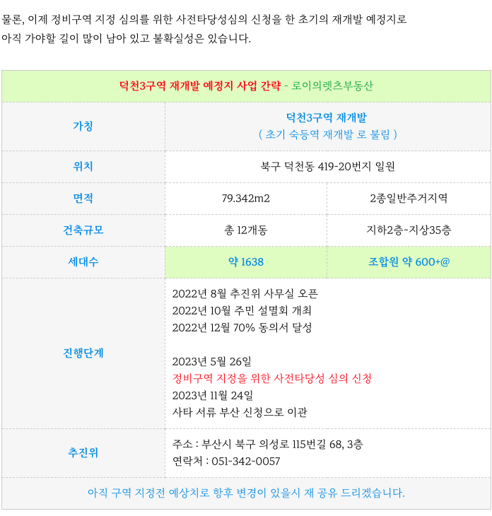 안녕하세요. 로이의렛츠부동산 ( 제이에이케이 부산 부동산중개법인 ) 입니다. 오늘은 덕천3구역 (구 숙등...