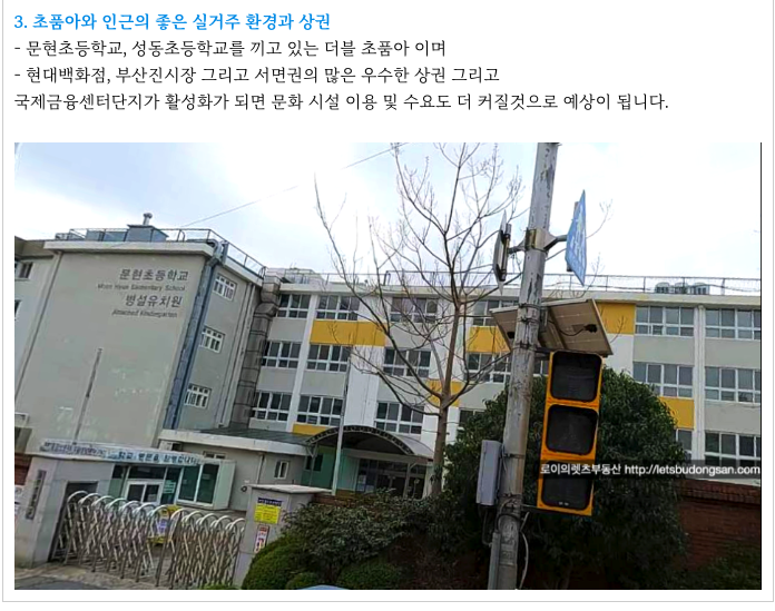 전체 2772(2367)세대의 인근 최대 단지이고, 문현초등학교를 끼고 있는 초품아 이며