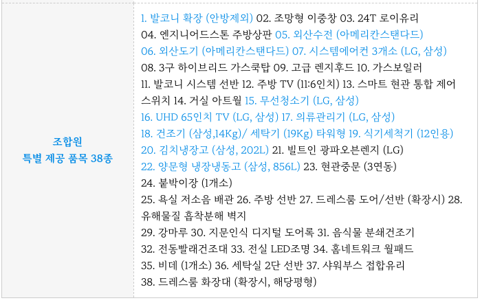 - 조합원 분들에게 지급되는 품목 역시도 고급 내장제와 우수 가전제품 으로 큰 혜택이 됩니다.
