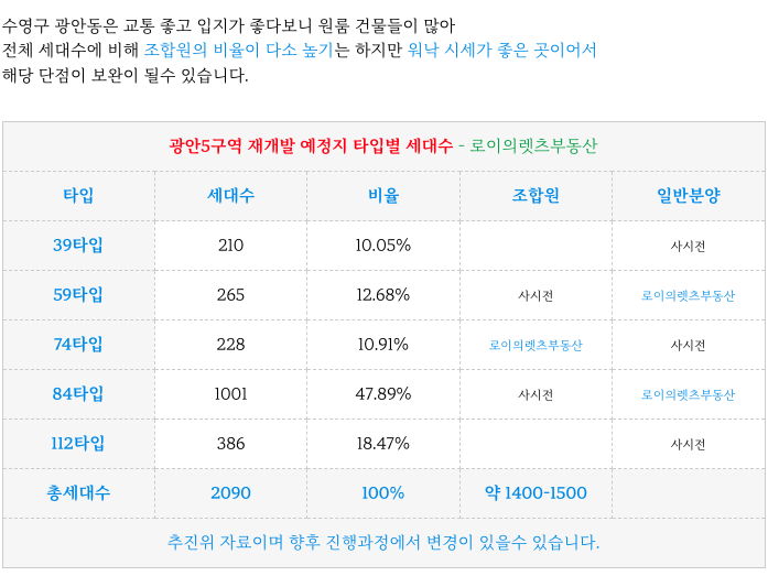 광안5구역 재개발 추진위의 예상 타입별 세대수 입니다.