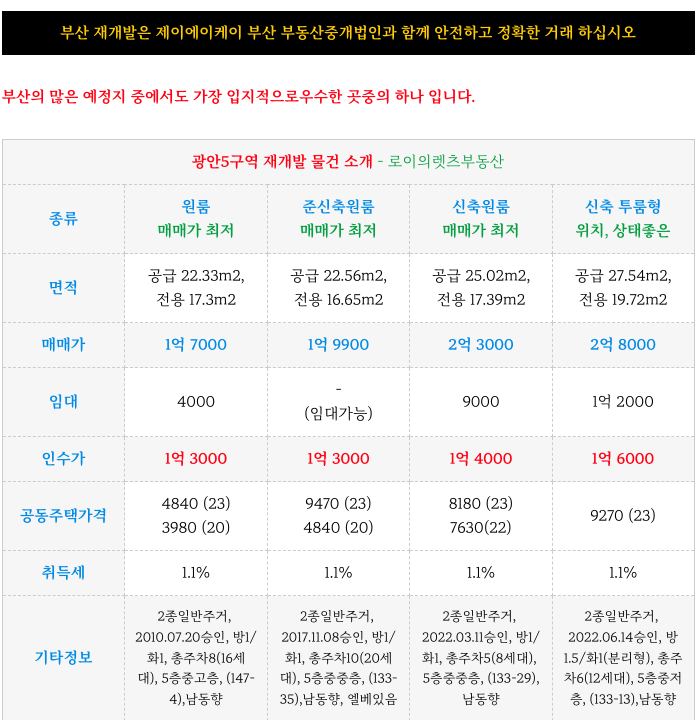 광안5구역 재개발 최저 시세 물건 정리하여 소개해 드리겠습니다.