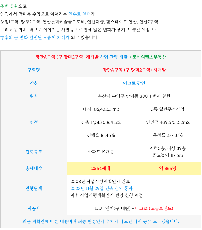 광안A구역 (구 망미2구역) 재개발의 특징과 장점을 간략하게 다시 정리해 드립니다.
