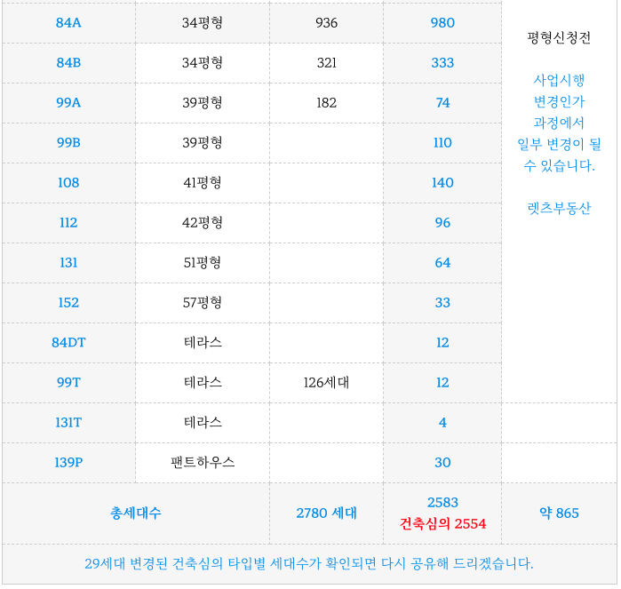 알려진 변경 세대수는 2583세대 였으나 금번 건축심의에서 2554세대로 29세대가 감소하였으나