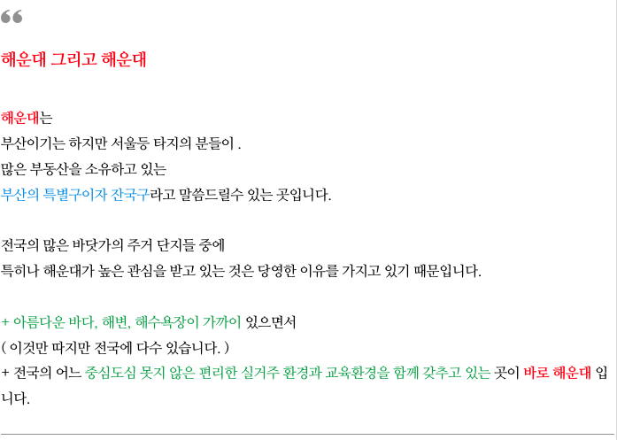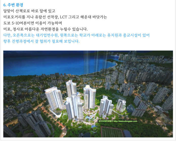 조합원의 다소 비율이 높은 것이 단점이기도 하지만 해운대라는 특성상 주변 시세가 워낙 좋아