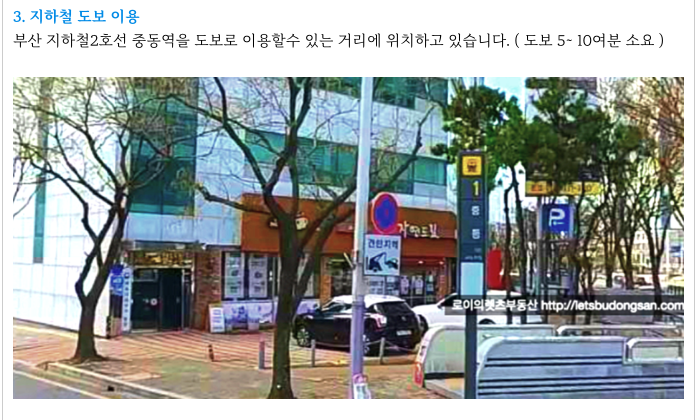 부산 지하철 2호선 중동역에서 도보 5분~10여분 거리에 위치하고 있는 준 역세권 이며