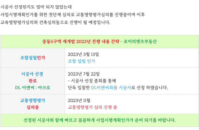 중동5구역 재개발은 시공사 선정후 첫단계로 교통영향평가 심의를 진행중에 있습니다.