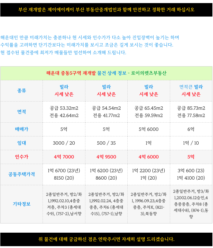 해운대 중동5구역 재개발 최저 빌라 물건 정보를 소개해 드립니다.